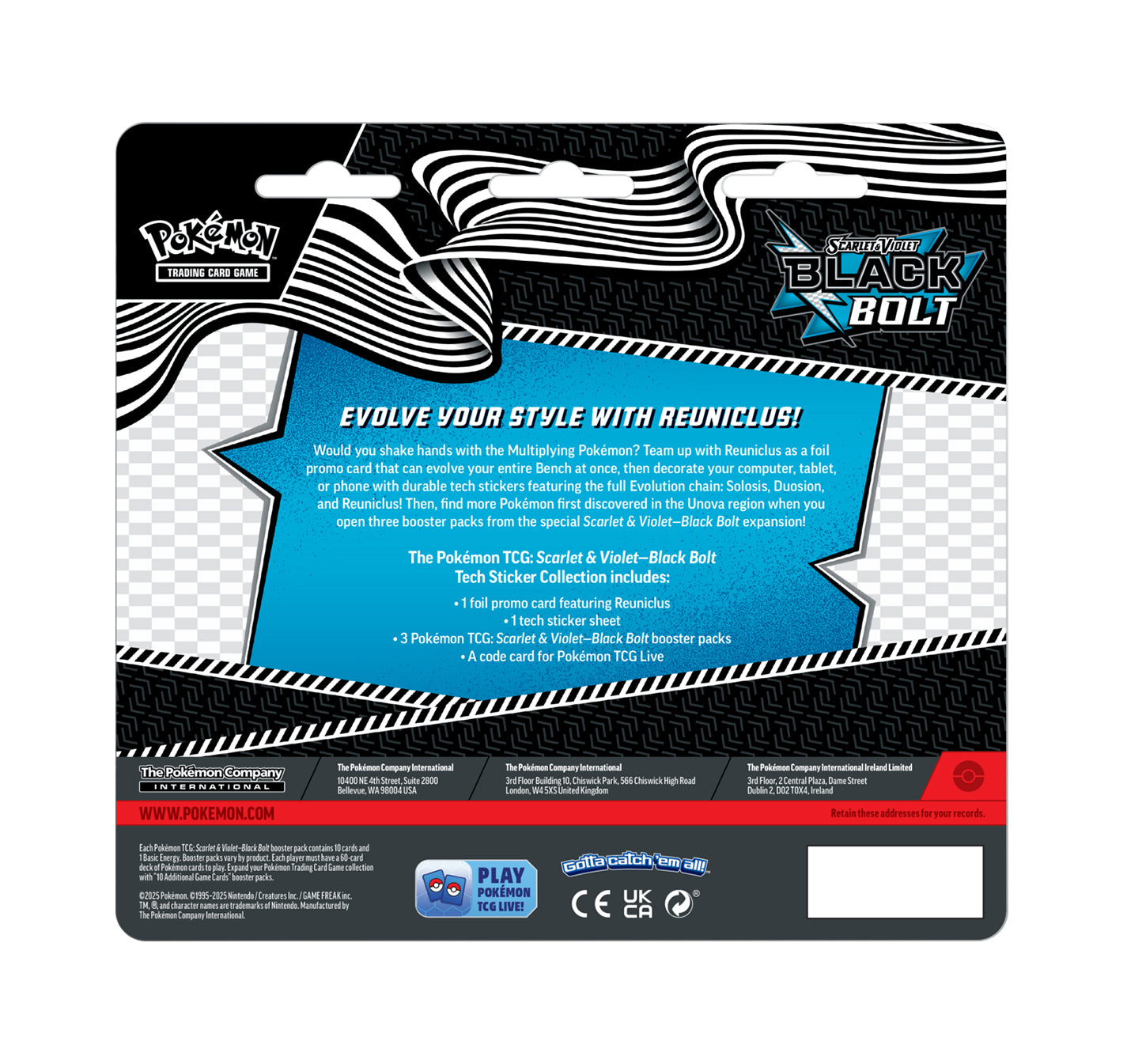Pokémon TCG: Scarlet & Violet – Black Bolt Tech Sticker Collection je praktická sběratelská kolekce, která kombinuje karty Pokémon TCG s tematickými „tech“ samolepkami z edice Black Bolt. Ideální volba pro hráče i sběratele, kteří chtějí rozšířit svou sbírku a získat exkluzivní promo kartu.